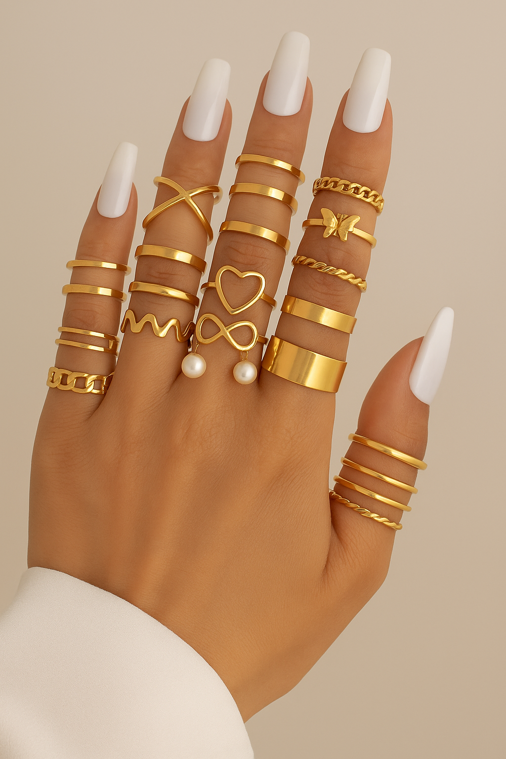 Anéis dourados delicados, com design variado (corações, infinito, pérola, geométricos e outros).